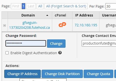• changer l’adresse IP du cPanel pour correspondre à celui de gfh.futehost, il faut que ça soit 72.10.160.195