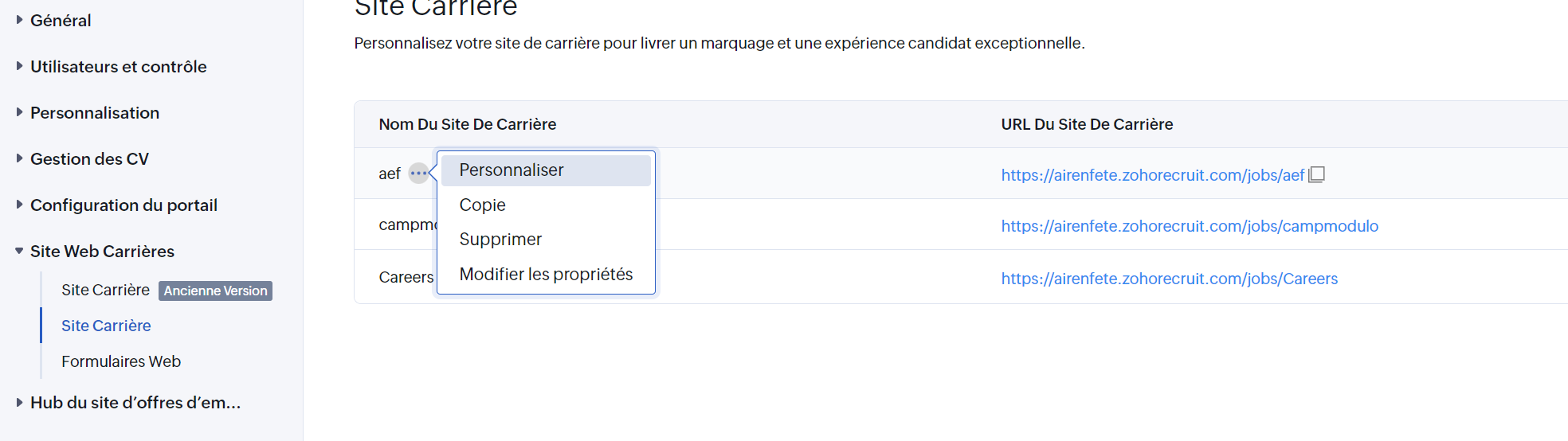 Dans le menu à gauche, aller dans Site Web Carrières -> Site Carrière.