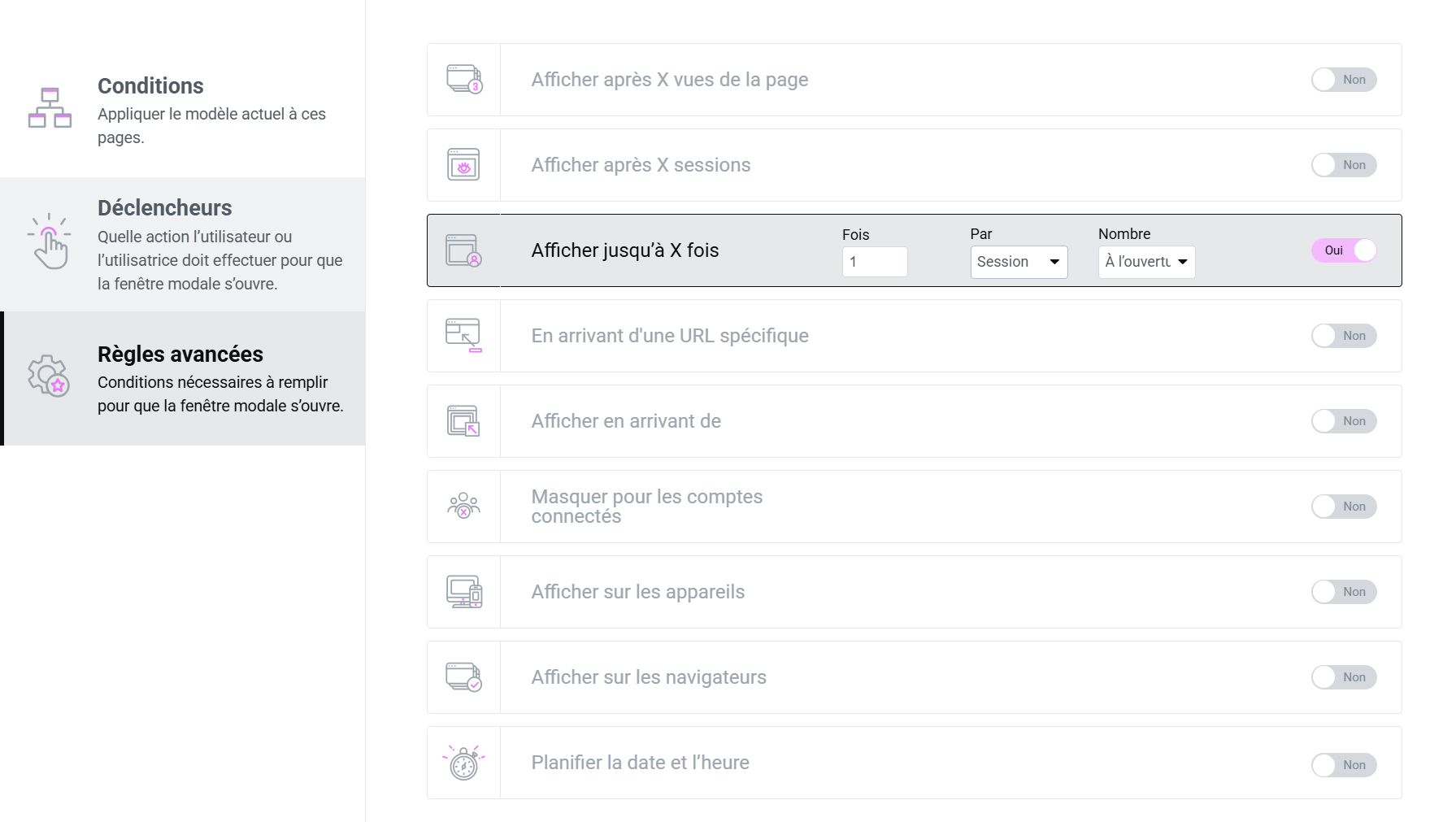 Ce qu’on utilise le plus souvent c’est l’affichage jusqu’à 1 (ou 3) fois par session. - Autres conditions : on peut aussi choisir d’afficher le popup seulement sur certains formats (ex : uniquement sur mobile), seulement certains navigateurs (ex : sur Chrome mais pas Safari).