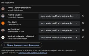 4. Dans la nouvelle page qui s’affiche, défiler jusqu’à la section « Partagé avec ». SVP y ajouter  » serviceclient@effetfute.com avec la permission « Apporter des modifications et gérer… »